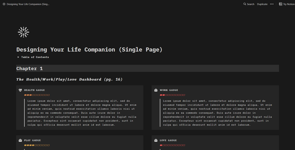 A Notion template to serve as your companion while reading Designing Your Life. This template provides a place to organize your thoughts and exercises while reading the book, all on a single page template.